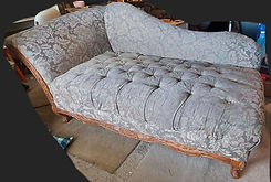 After: Chaise Lounge was upholstered in new rich fabric. Structural issues have been repaired. Client did not want the wood refinished.